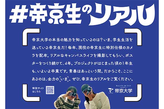 学校法⼈帝京⼤学(本部:東京都板橋区、理事長・学⻑:冲永佳史)は、本学学生がカメラマンとなって撮影した写真を使い、延べ総勢400人以上が出演する「#帝京生のリアル」を今年もInstagramで投稿しています。また、2026年4月6日(月)より写真を使った交通広告を京王新宿駅 中央地下連絡道で掲出します。今年で4年目を迎える「#帝京生のリアル」では、帝京大学の本当の魅力を伝えるために、本学のことを最もよく知っている在学生に特別仕様のカメラを配布、リアルなキャンパスライフを撮影してもらう試みを実施しました。実際に撮影された写真を使った22種のグラフィック広告は、八王子キャンパスや福岡キャンパス、それぞれのキャンパス周辺でも今後展開していく予定です。