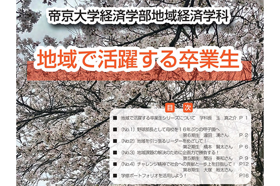 地域経済学科は2011年4月に開設し、2024年3月には第10期生を社会に送り出します。それを記念し「地域で活躍する卒業生」をテーマに、さまざまな分野で活躍する卒業生にインタビューをしています。現在の仕事、やりがい・大学での学びで役立っていること・学生時代の想い出など、在学生はもちろん受験生にも参考になる冊子です。