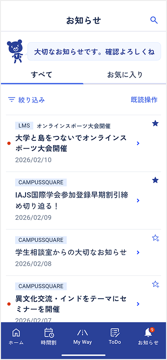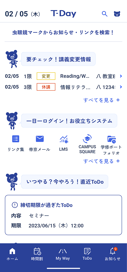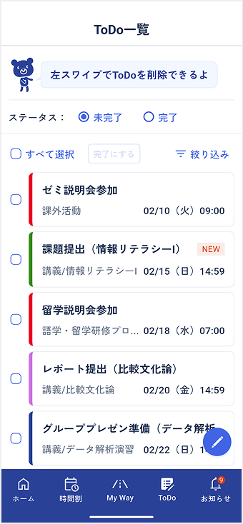 締切り期限が近づいた提出物などが「ToDo一覧」に表示され、