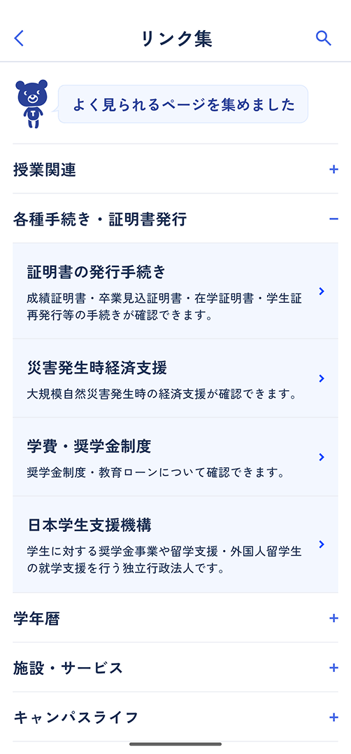教室変更や休講となった講義を確認できる「講義変更情報」など、