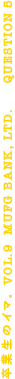入行してからこれまで、出会う先輩も後輩も尊敬できる人たちばかり。出身大学や、これまでの経験も非常に多彩です。おおらかで穏やかな社風ですが、社員がトップバンクとしてのプライドをもっており、高い社会(世界)貢献意識に加えて、冷静な融資判断をする企業文化が特徴。若手が活躍できる環境も、当行の魅力です。